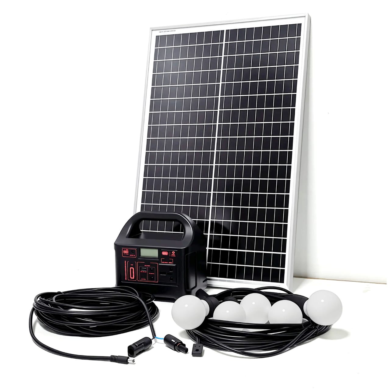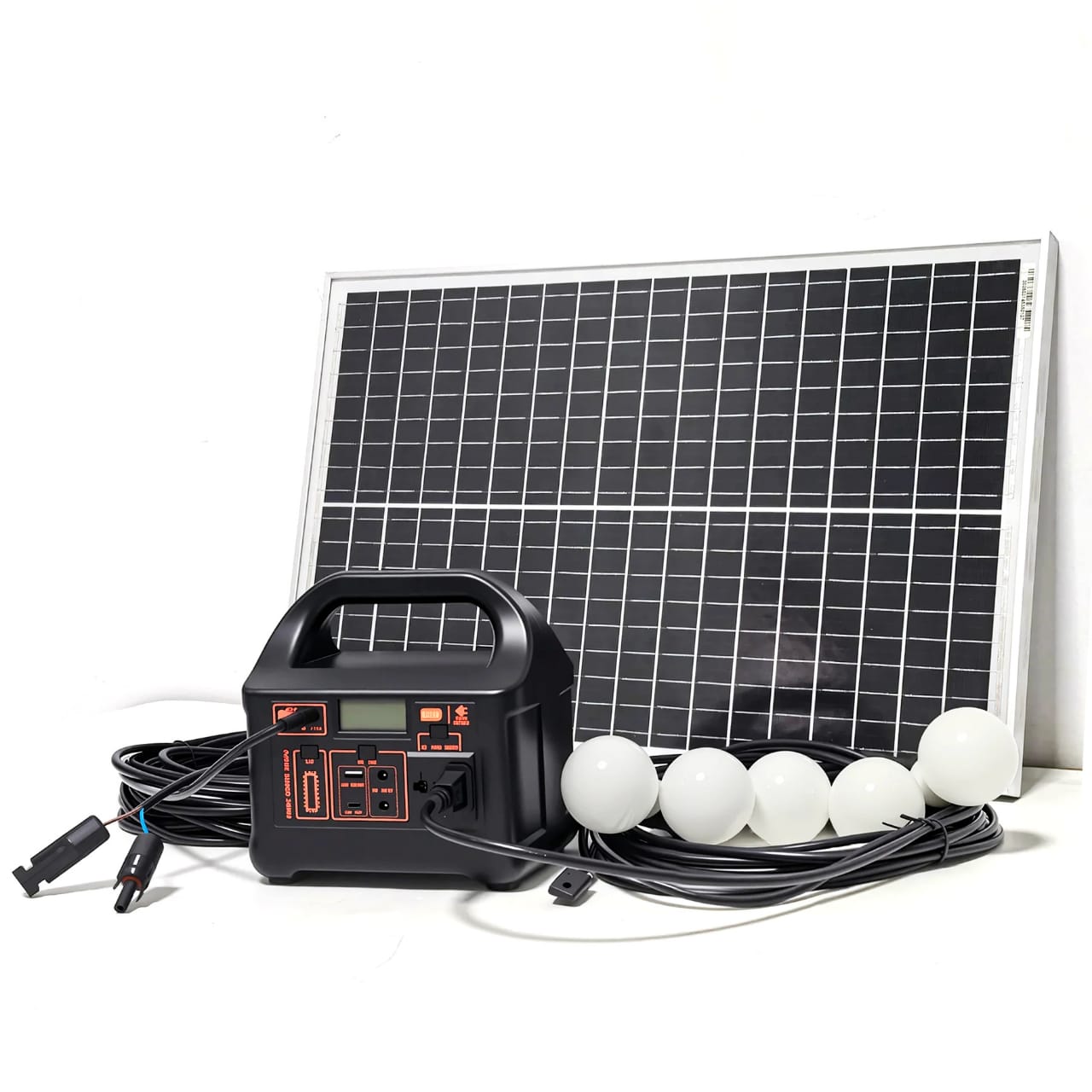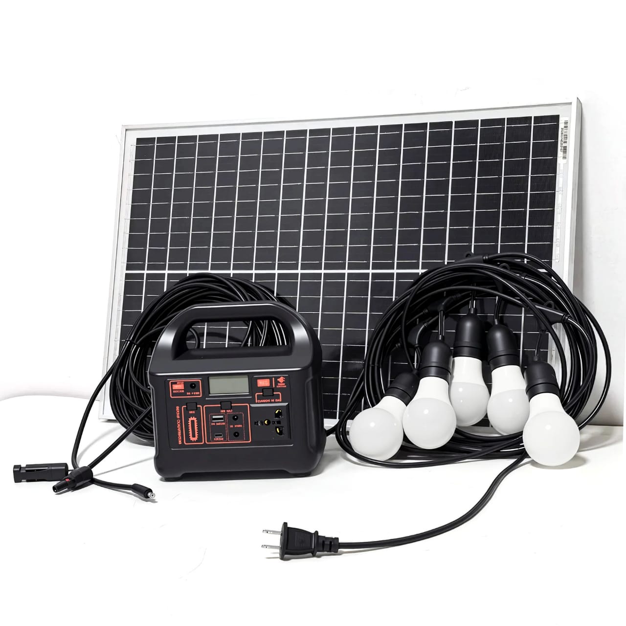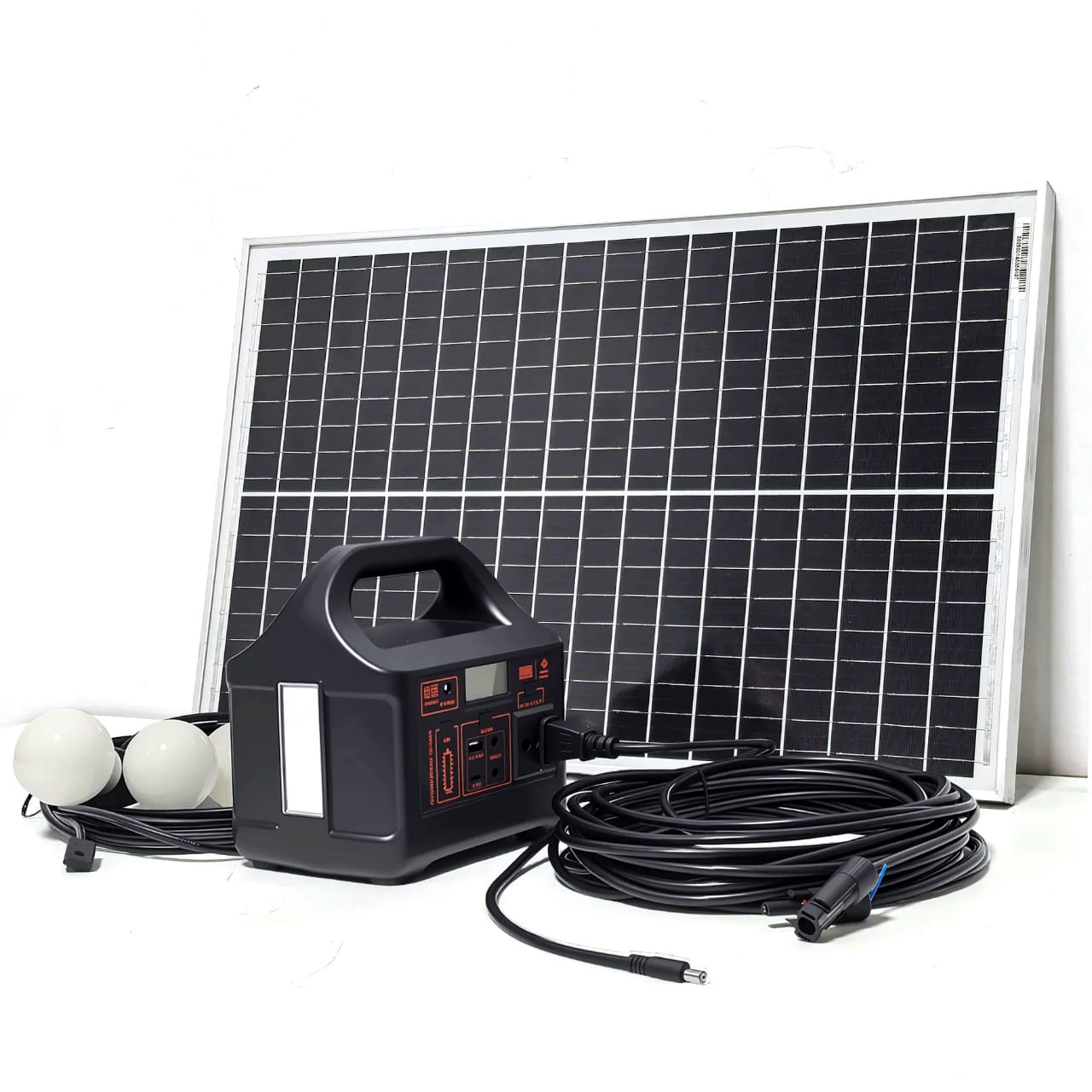 This solar power generator offers a reliable and sustainable power solution for home or outdoor use. It includes a 45W solar panel, a mobile power supply with a 200W capacity, and multiple outlets for charging devices. The system also comes with LED bulbs for lighting during power outages or in off-grid locations. This eco-friendly energy solution is ideal for emergencies, camping, and homes in areas with frequent power cuts, providing clean, renewable energy for everyday use.