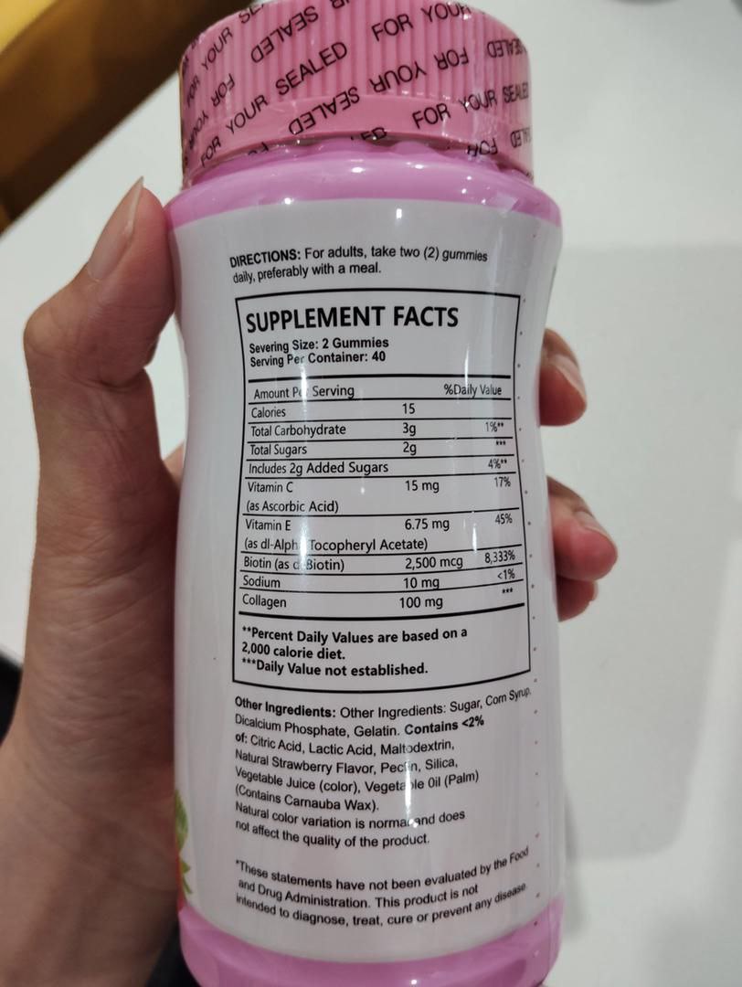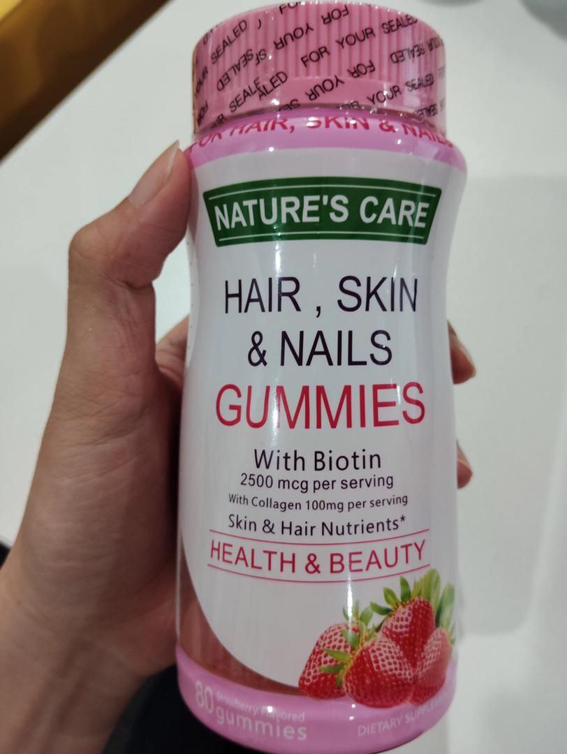 Hair Skin and Nails Gummies with Biotin 2500mcg, Collagen, Vitamin C and E. Supports healthy hair, glowing skin, and stronger nails. 80 gummies per bottle.