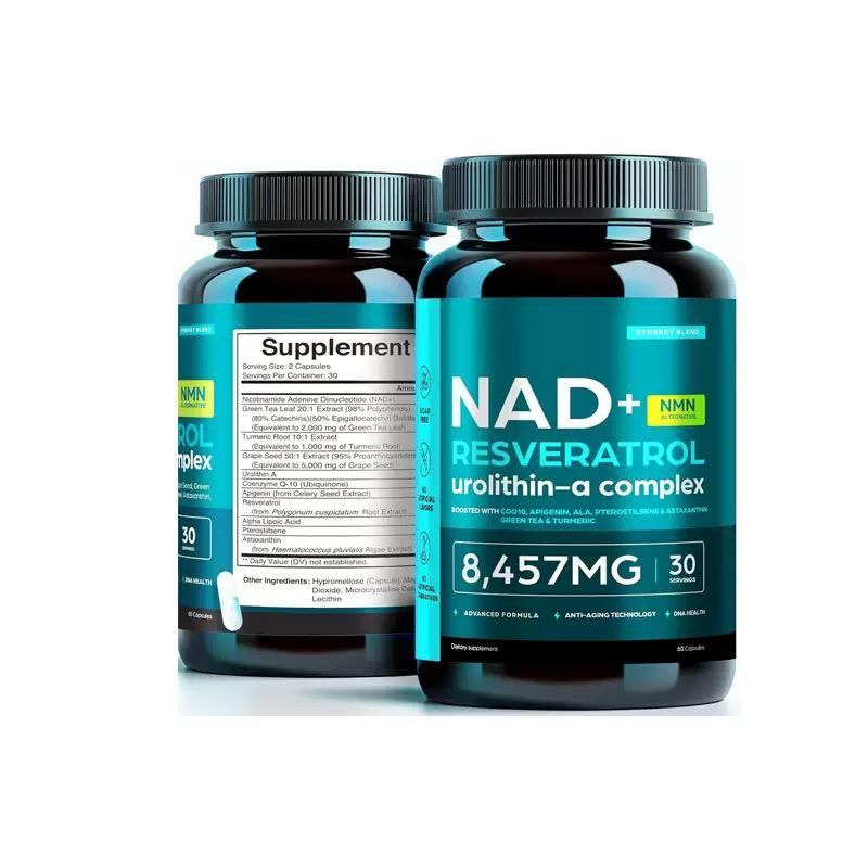 Support your immune health and combat aging with NAD+ Resveratrol Urolithin-A Complex. Each 30-capsule bottle contains 8,457mg of advanced ingredients to enhance cellular repair, boost energy, and improve overall vitality.